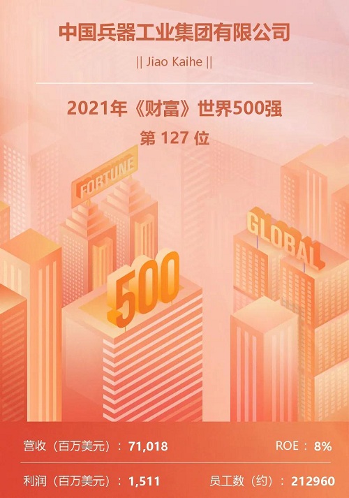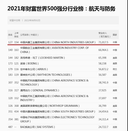 兵器工业集团位列2021年世界500强第127位 |